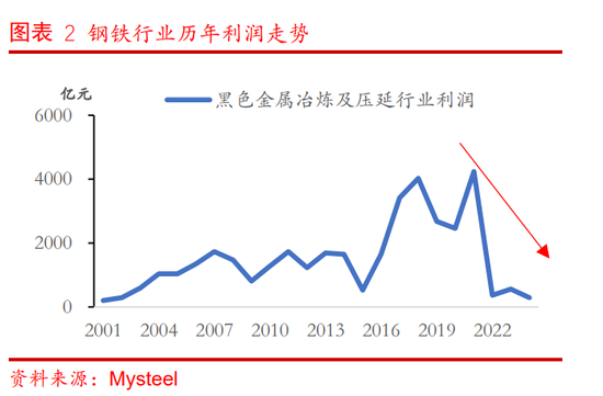 自2021年地产行业周期性见顶以来,钢铁行业需求近几年持续下滑,价格走势偏弱令利润持续压缩。2024年黑色金属冶炼及压延行业利润为291.9亿元,比2023年回落272.9亿元,且利润下滑趋势尚未看到改善迹象。